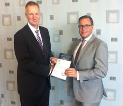 Photo: David Westwood (left) is pictured presenting John May with his IDIS Certified Engineer Certificate.