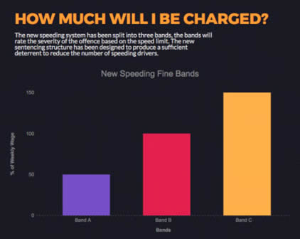 The new speeding system has been split into three bands, the bands will rate the severity of the offence based on the speed limit. Band A will relate to an offence that is between 1 and 10mph over the speed limit. Offences in the B band are for drivers who are caught from 11 to 21mph over the legal speed limit, a band C offence is above 21mph and above the stated speed limit.